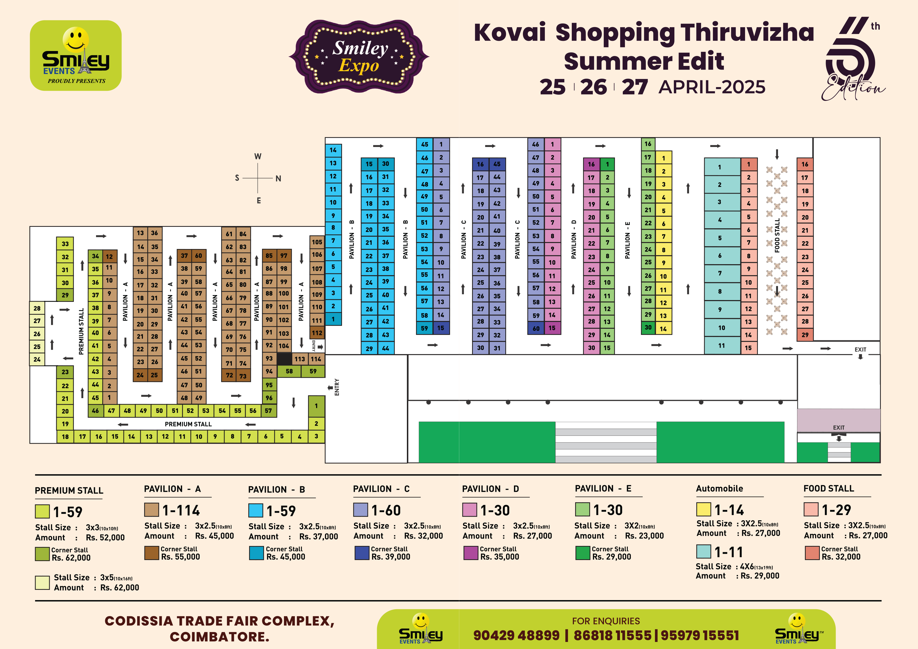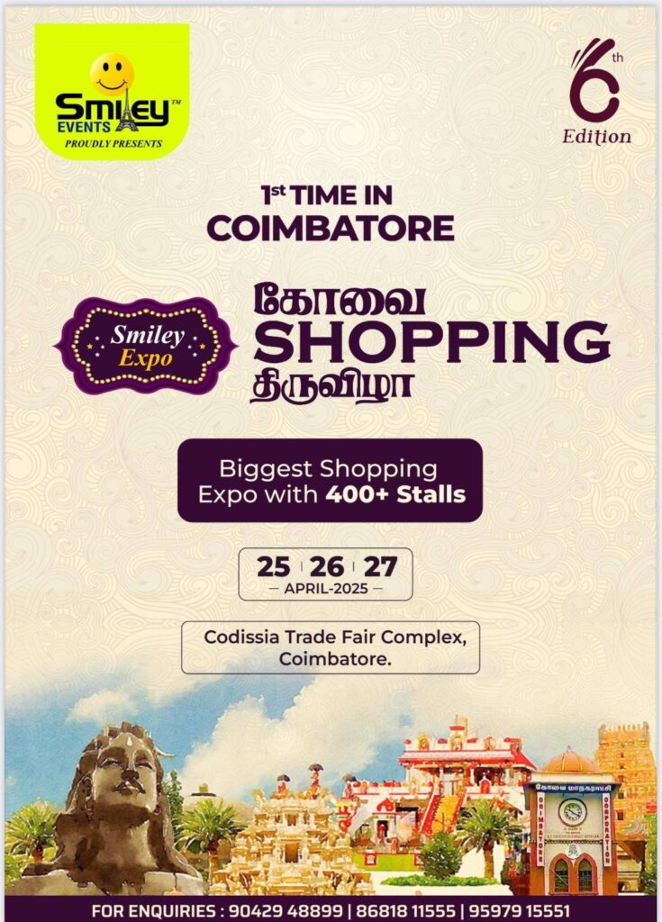 Welcome to Coimbatore’s Biggest Shopping Expo – Smiley Expo 2025! Get ready for an unforgettable shopping experience at the Codissia Trade Fair Complex, where 400+ stalls await you, showcasing a diverse range of products from household essentials, trendy dresses, and stylish furniture to cars, bikes, and much more. This exciting event also features an exclusive food festival, offering a variety of delicious treats from around the world. Whether you’re shopping for your home, your wardrobe, or looking to indulge in great food, Smiley Expo 2025 has something for everyone. Join us for three action-packed days of shopping, fun, and entertainment!